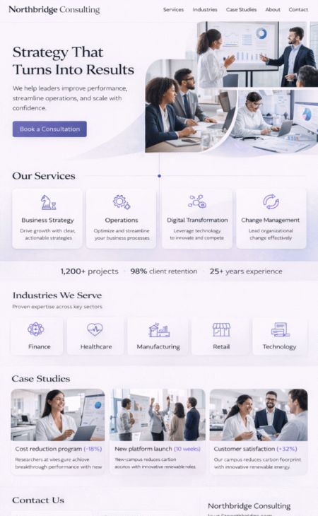 신뢰 구축: 명확한 서비스, 사례 연구, 자주 묻는 질문, 예약 및 라이브 영상 상담.